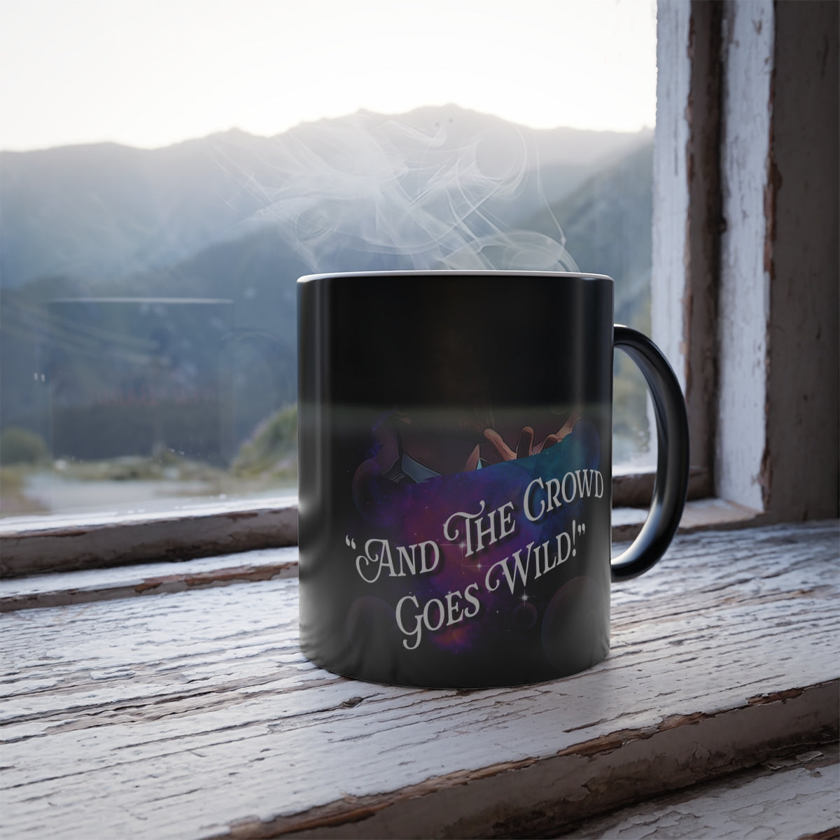 River Barry color changing mug. This one changes color and will be the gift that keeps on giving. The heat-reactive surface reveals our custom designs once the mug gets warm. The ceramic cup will go back to its original black outside and white inside when it cools down. The C-shaped handle helps keep a sturdy grip. It comes in one size – 11oz (0.33l) – plenty for that big morning cup of coffee.